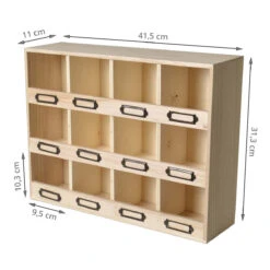 Ce rangement en bois a un joli aspect vintage. Il peut se poser sur un meuble mais aussi être fixé au mur en y ajoutant des attaches.