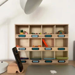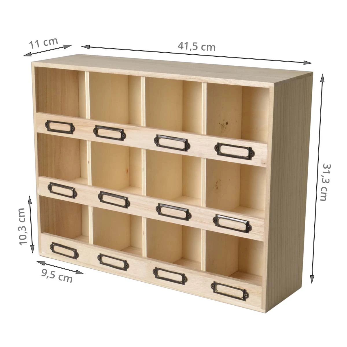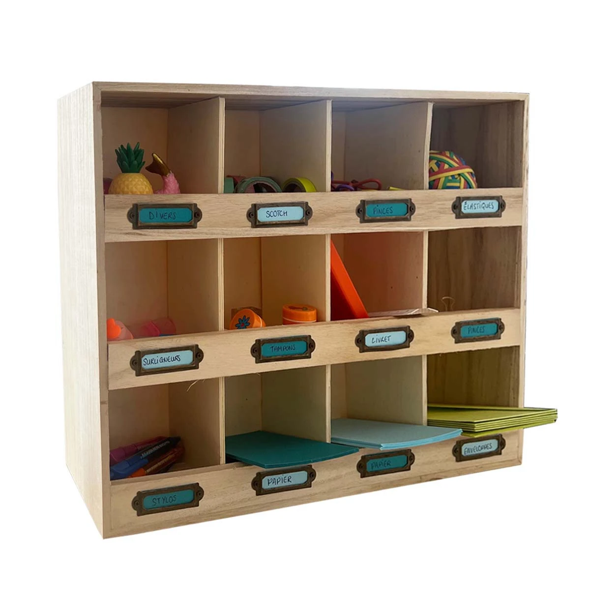 Ces 12 petits casiers en bois sont utiles pour ranger des clĂ©s dans une entrĂ©e (ou un hĂ´tel), des fournitures dans un bureau, des accessoires dans un atelier, des Ă©pices dans une cuisine. Avec ses porte-Ă©tiquettes mĂ©talliques, chaque casier a une destination ce qui facilite l’organisation.