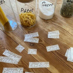 Ces 24 autocollants blancs sont très pratiques pour étiqueter joliment des bocaux de cuisine. De bonnes tailles, ils permettent de retrouver tout de suite les ingrédients alimentaires et d’optimiser le rangement des placards de cuisine. Ces étiquettes se posent facilement, résistent dans le temps et sont esthétiques. Seules les lettres sont autocollantes. Il n’y a pas de carré autour.