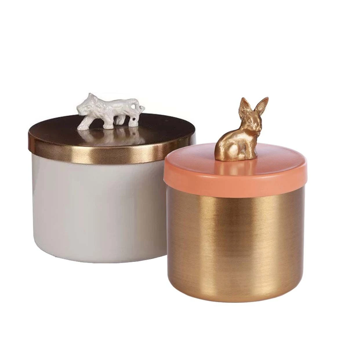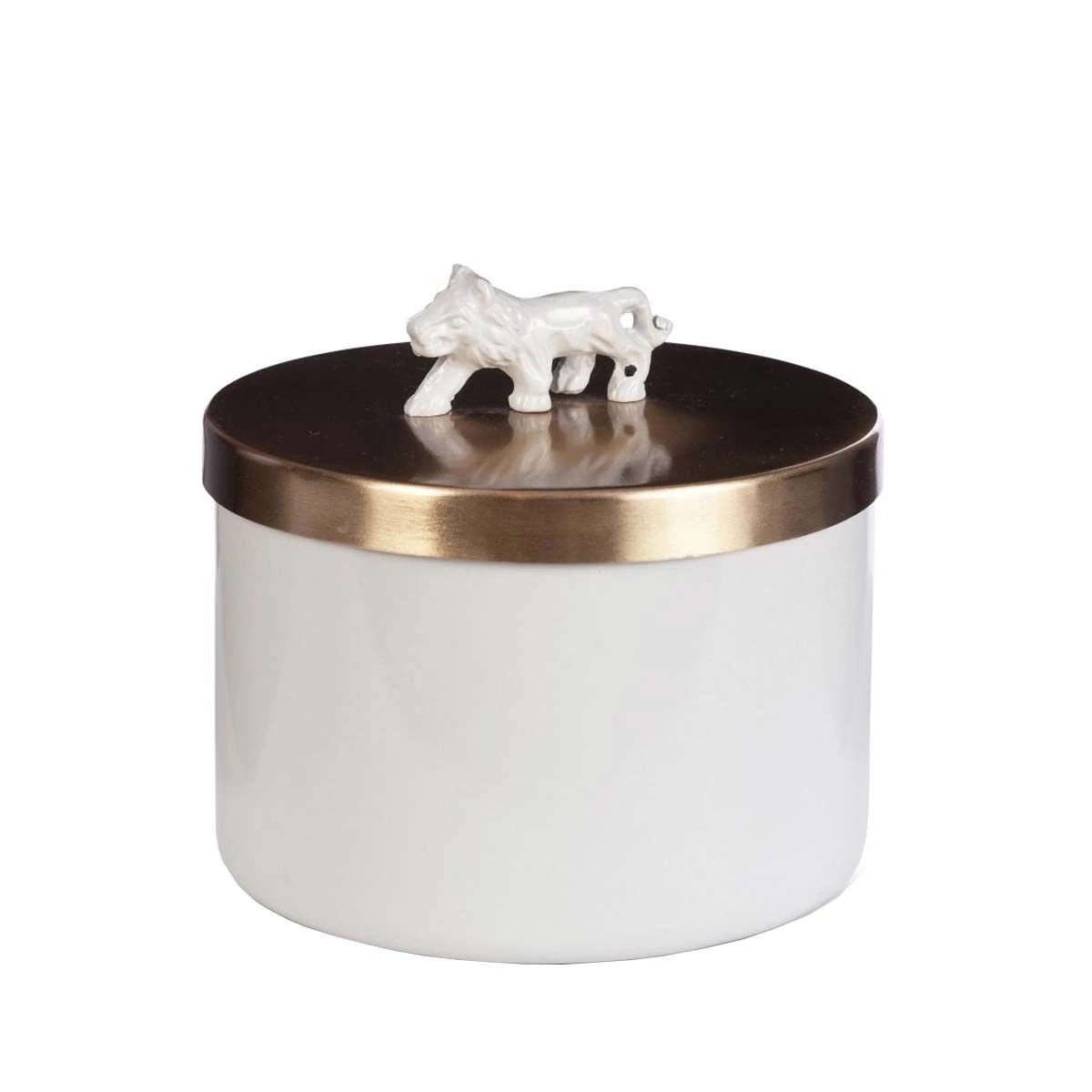 Couvercle doré avec lion en céramique blanc.