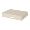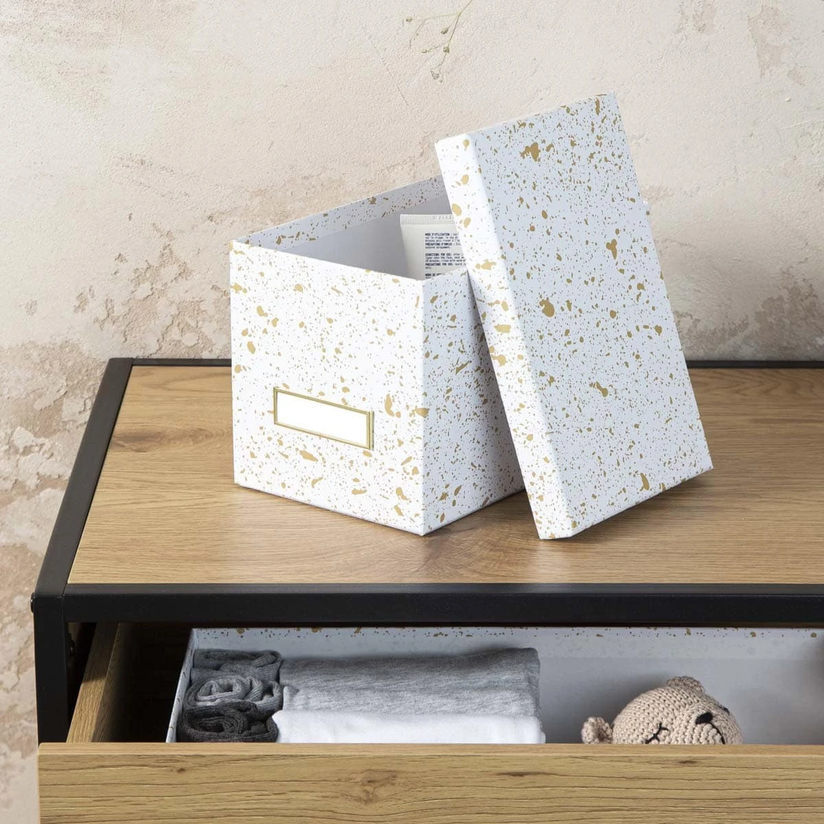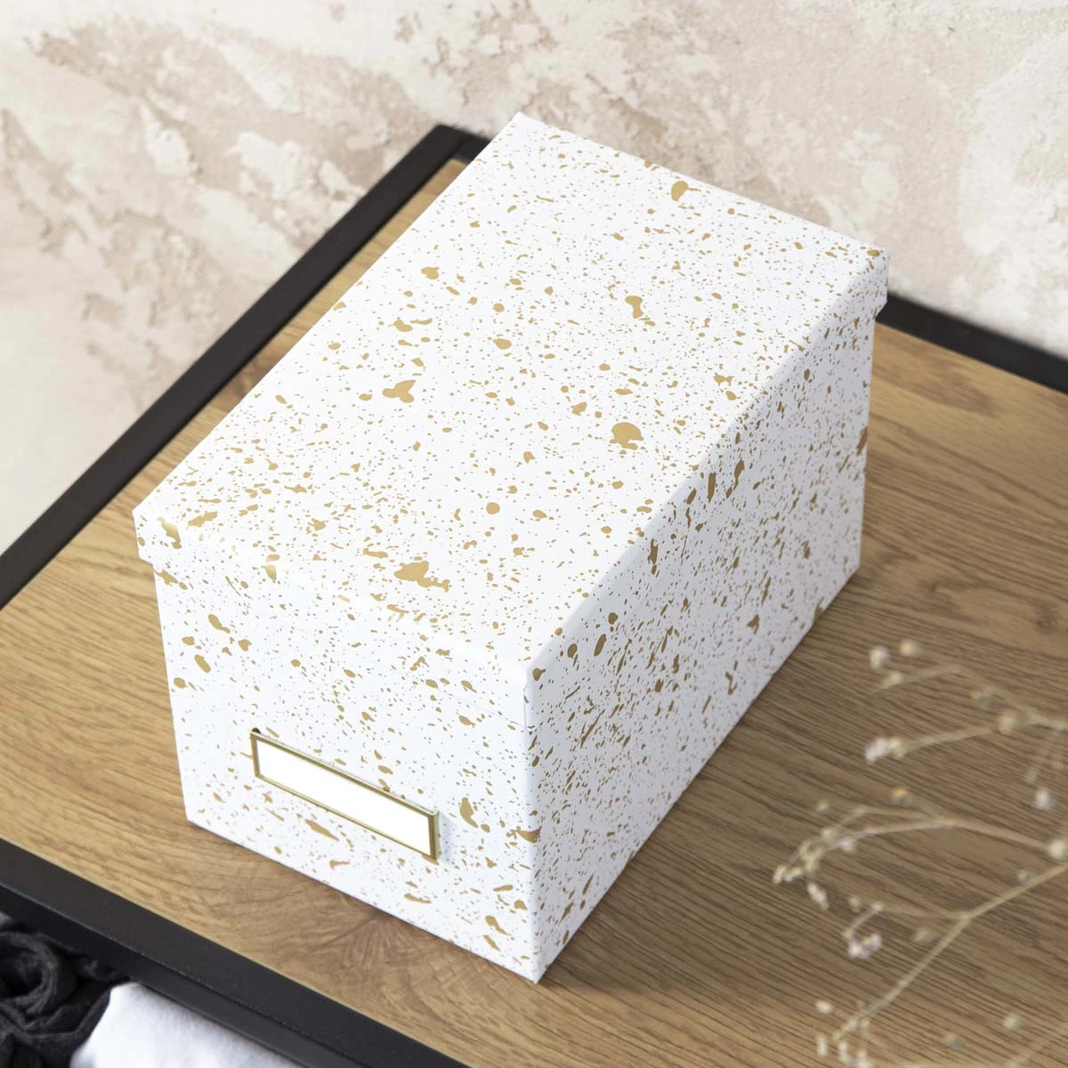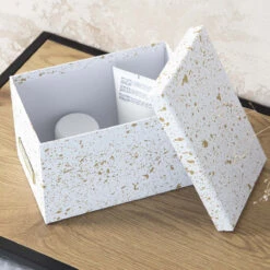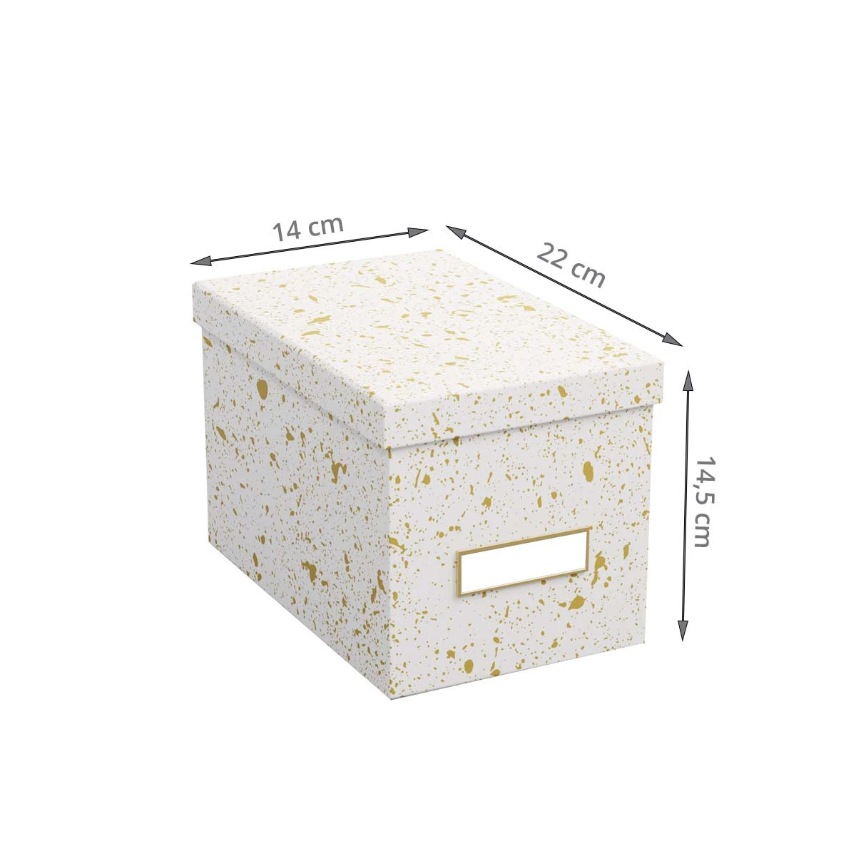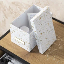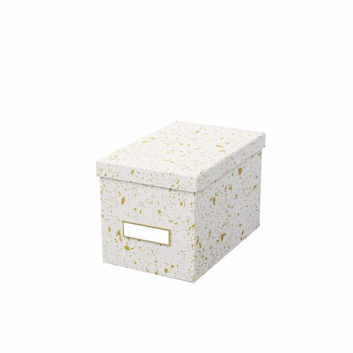 Cette jolie boîte en carton recouverte de papier blanc et doré est idéale pour ranger des CD mais aussi des accessoires de bureau, du matériel High tech, jeux ou tout ce que nous avons besoin de ranger dans une maison. Cette boîte est élégante avec ses taches dorées sur fond blanc. Elle sera très décorative sur une étagère ouverte, une table ou un bureau. Son porte étiquette doré permet de noter ce qui est rangé dedans et de retrouver facilement ses affaires. Plusieurs accessoires de rangement existent dans la même collection.