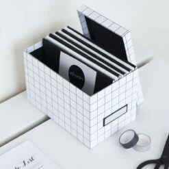 Cette boîte à CD a les dimensions idéales pour y ranger des CD mais aussi toute sorte de petits objets : fournitures de bureau, jeux de cartes, chargeurs et câbles, petit matériel de loisirs créatifs, enveloppes…. Avec son motif quadrillé noir sur blanc et son porte-étiquette noir, cette boîte est très décorative. Elle donne un style moderne et contemporain à un intérieur. Cette boîte en carton se décline avec le même motif dans d’autres formats pour former un bel ensemble de bureau.