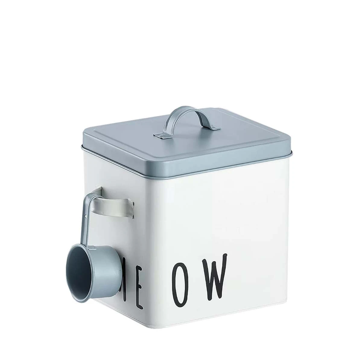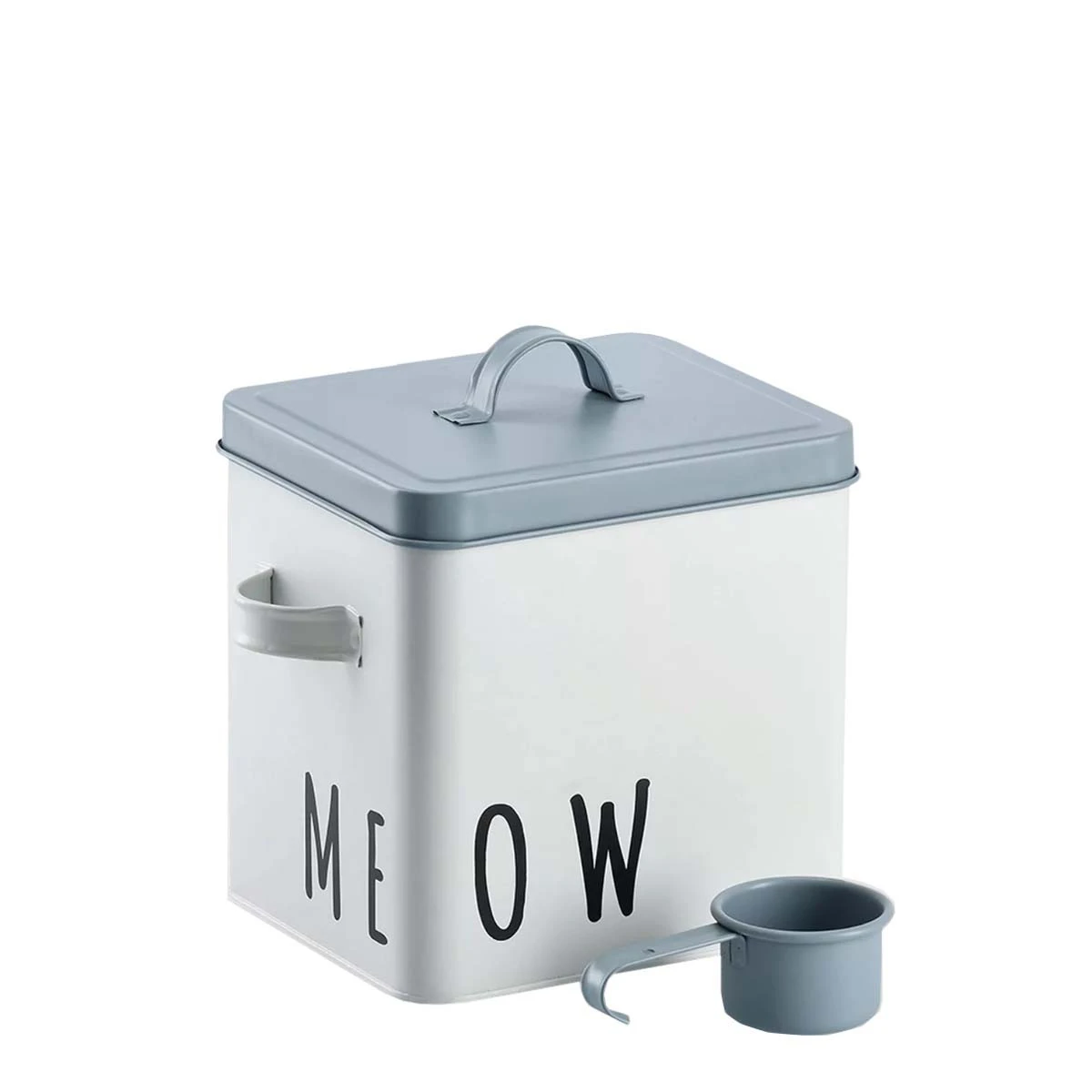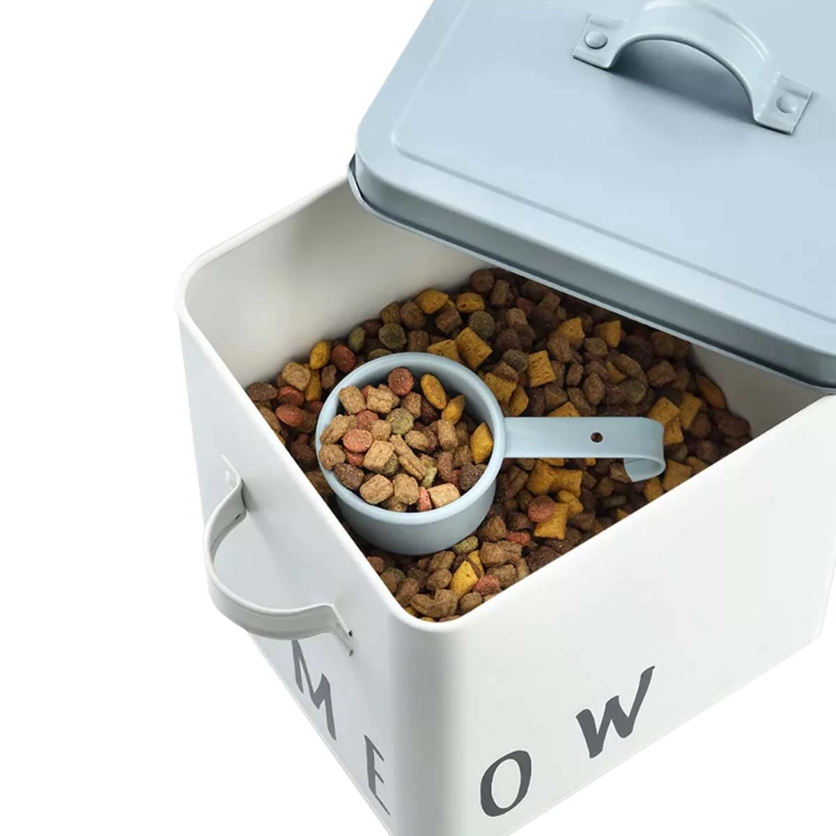 Cette boîte en métal de couleur crème vous aidera à stocker les croquettes de votre chat. Utilisez la pelle en métal chromé bleue pour verser la bonne dose de croquettes dans la gamelle de votre chat.