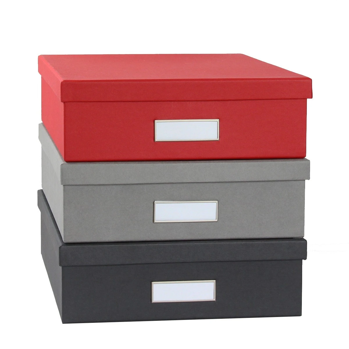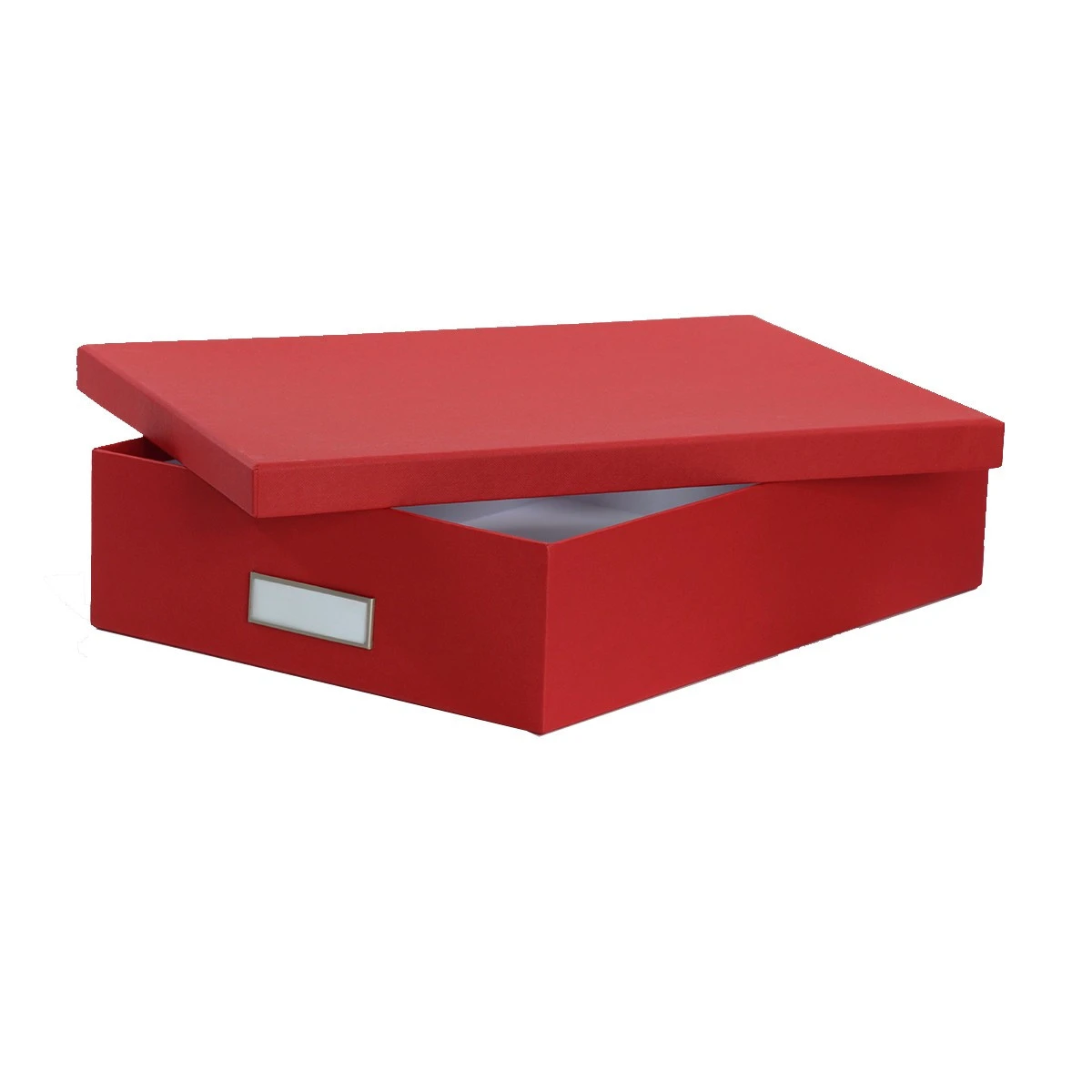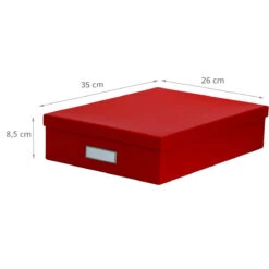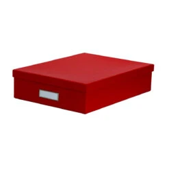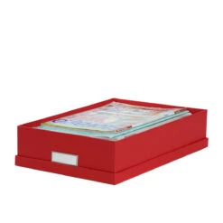 Boîte de rangement format A4 en carton recyclé blanchi recouvert de papier laminé rouge.