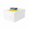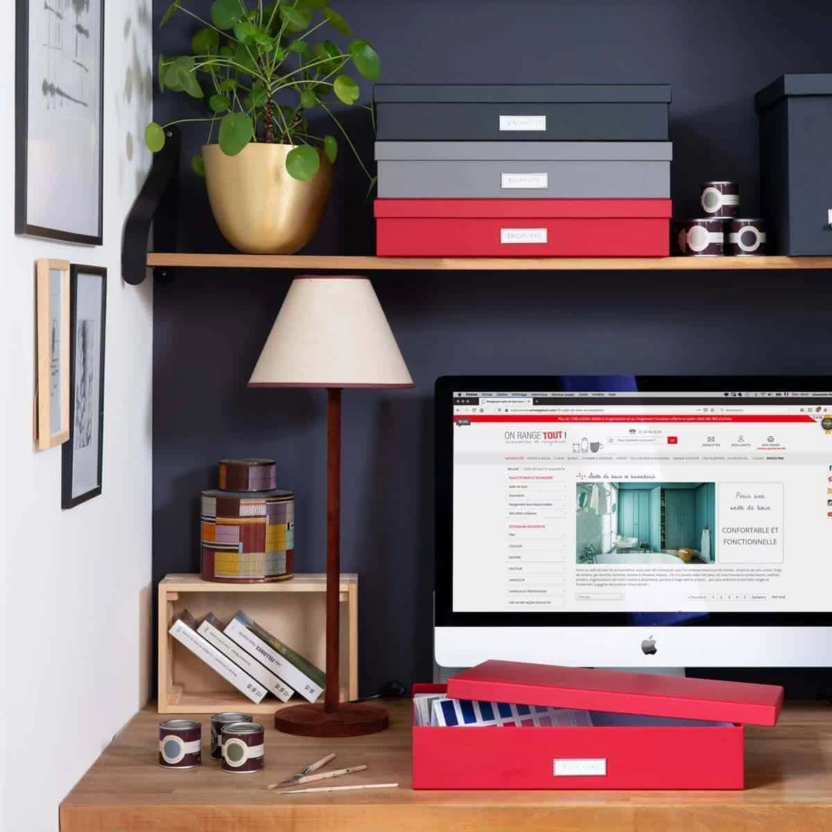 BoĂ®te de rangement ou d’archivage A4 en carton blanc recouvert de papier laminé rouge.
