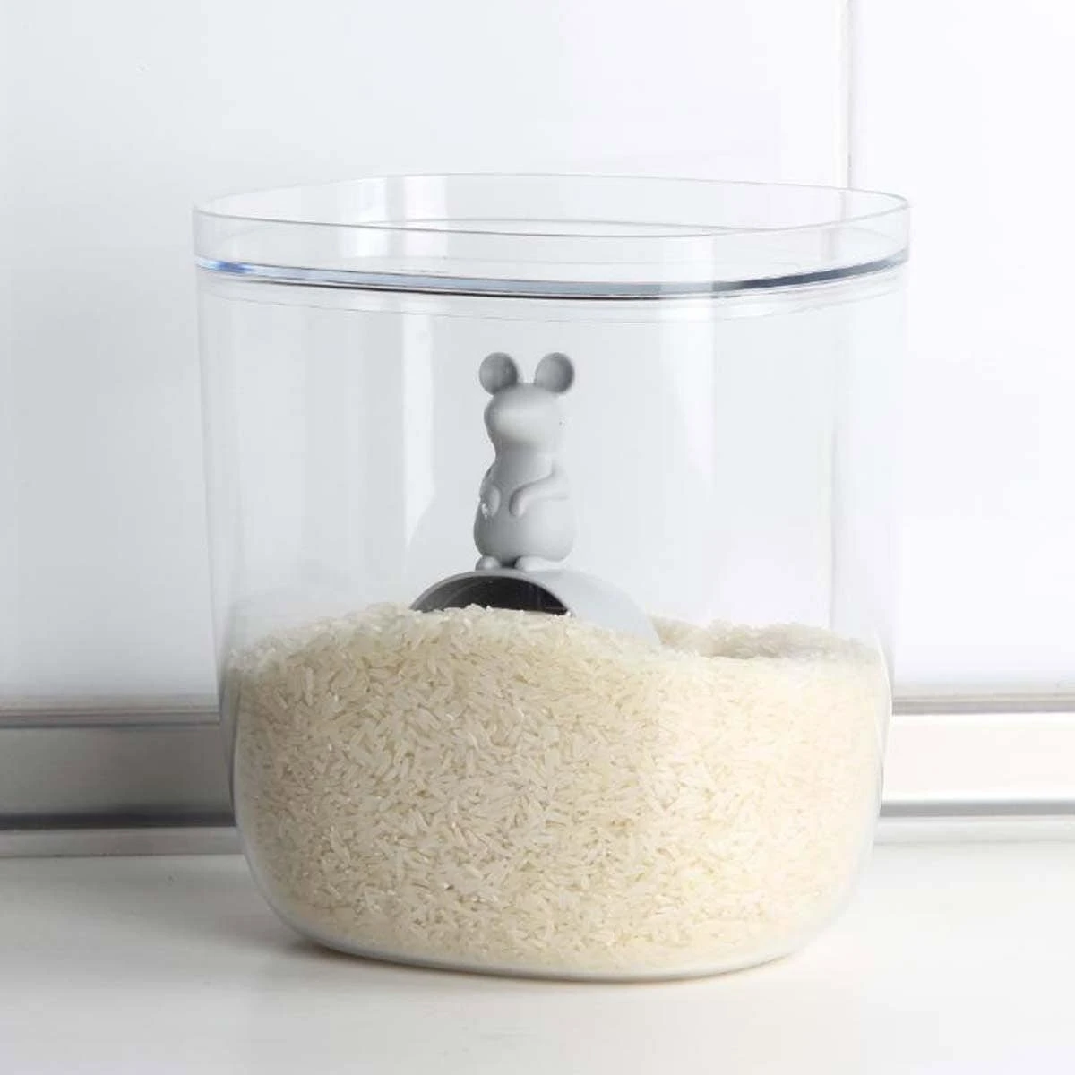 Cette boîte alimentaire transparente est très pratique pour stocker farine, sucre, céréales et féculents. Sa grande cuillère doseuse en forme de souris apporte un côté amusant et original dans une cuisine. Avec ses 3 graduations, la cuillère permet de doser les quantités. Une cuillère pleine représente 150 grammes de riz.
