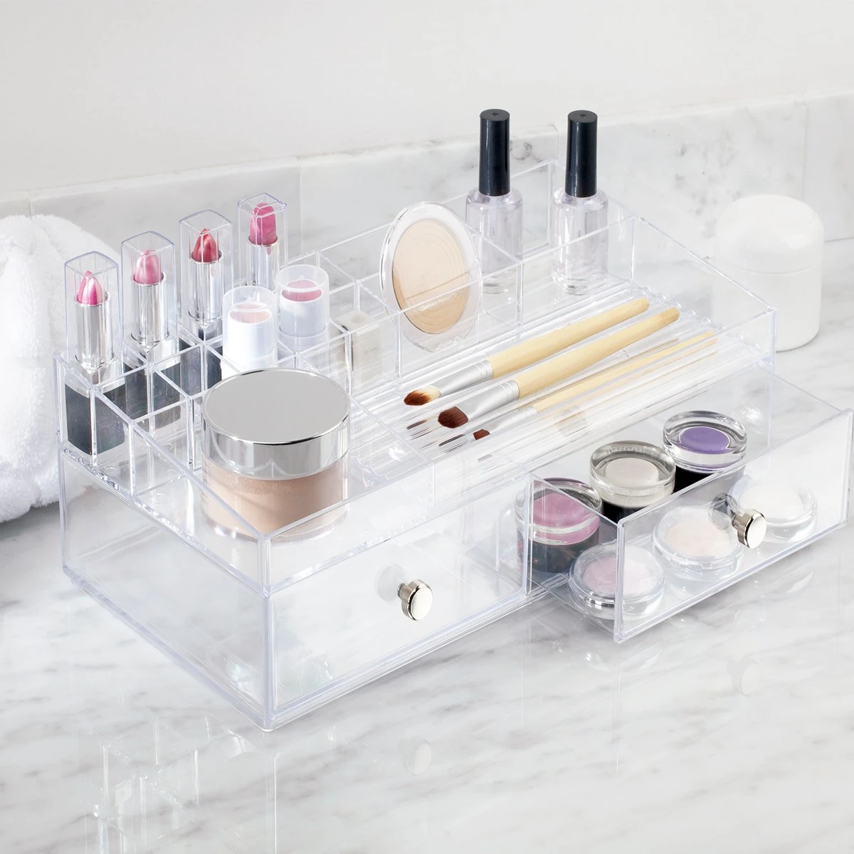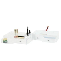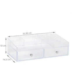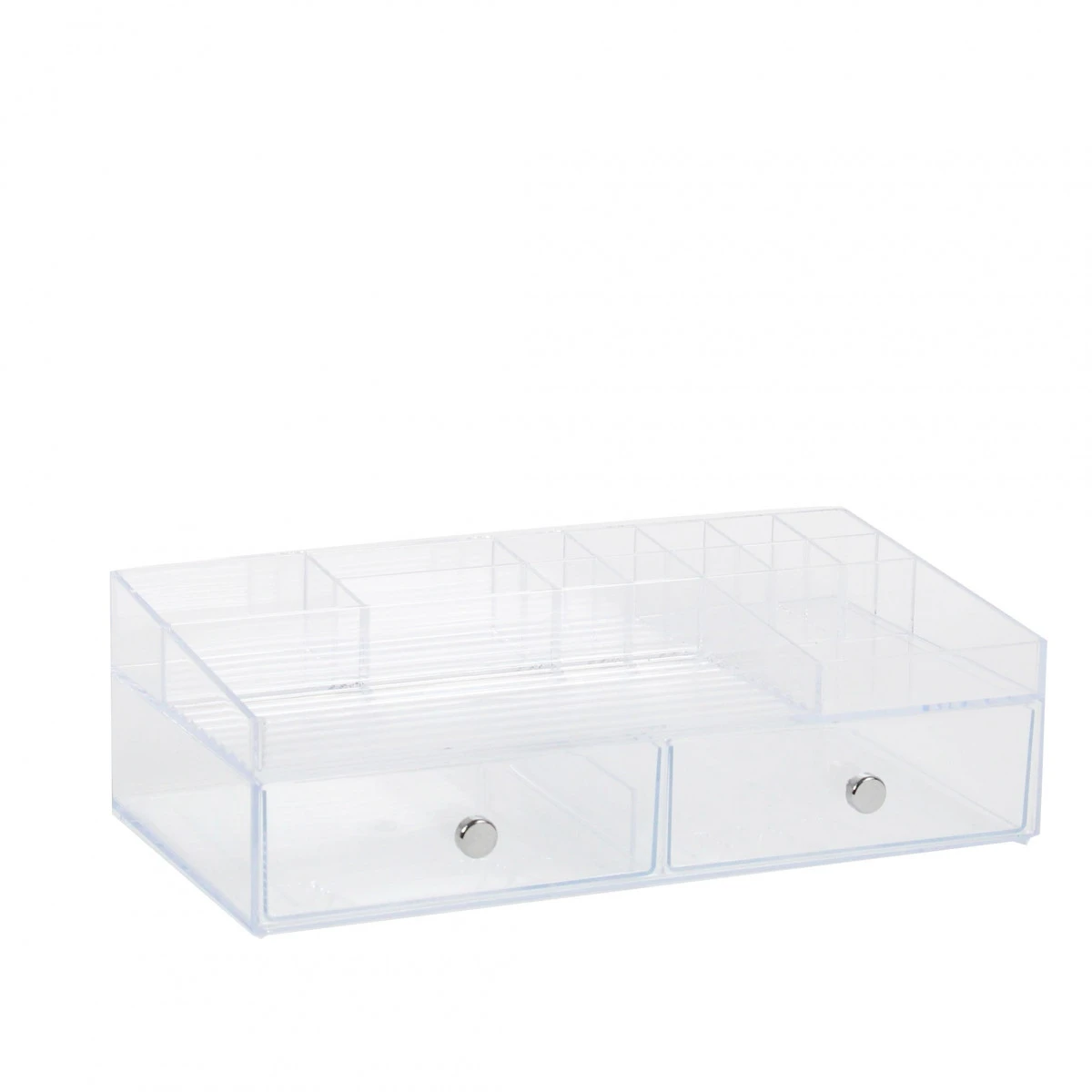 Boîte de rangement en acrylique transparent 2 tiroirs avec bouton chromé 15 compartiments au niveau supérieur.