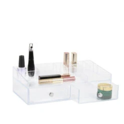 Voilà l’accessoire de rangement idéal pour toutes celles qui aiment se maquiller … sans passer trop de temps à rechercher le vernis à ongles orange qu’il lui faut absolument tout de suite. Cette boîte en acrylique transparent possède 2 tiroirs pour les fards, mascaras ou crayons mais aussi au-dessus toute une série de compartiments adaptés aux vernis, rouges à lèvres pinceaux et autres délicieux produits de maquillage.