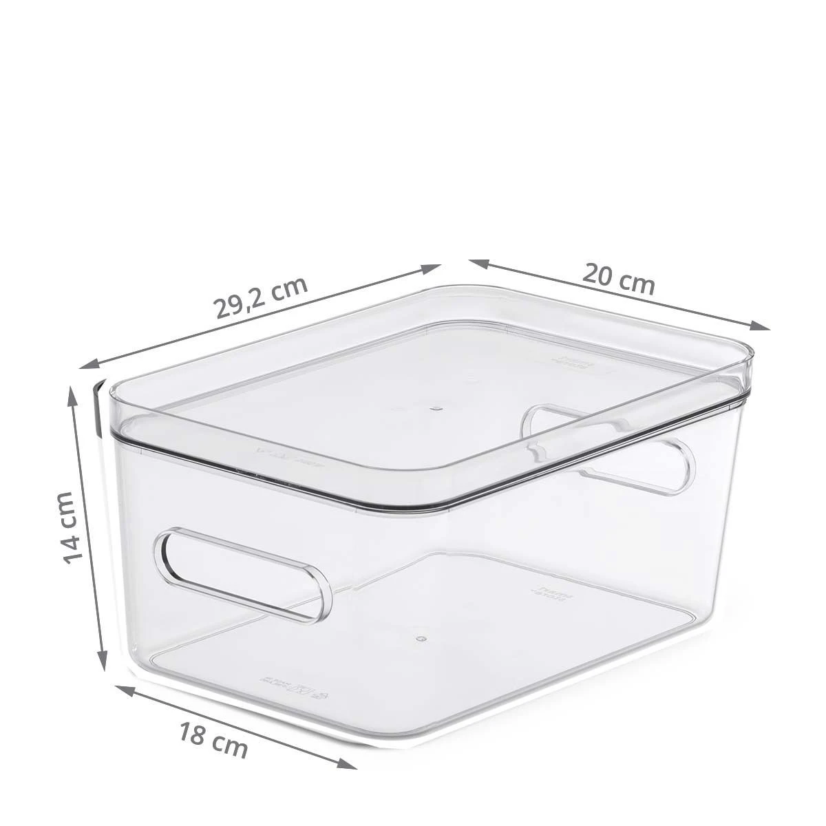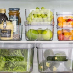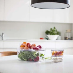 Cette boîte de rangement transparente est très pratique pour organiser un frigo. On peut y ranger des fruits ou légumes, des fromages ou yaourts, de la viande… et toute sorte d’aliments frais. Sa matière transparente permet de savoir exactement ce qui est dedans. Grâce à son couvercle cette boîte est empilable pour gagner de la place et exploiter toute la place disponible. Ses 2 poignées simplifient sa manipulation. Le couvercle peut également servir de plateau.