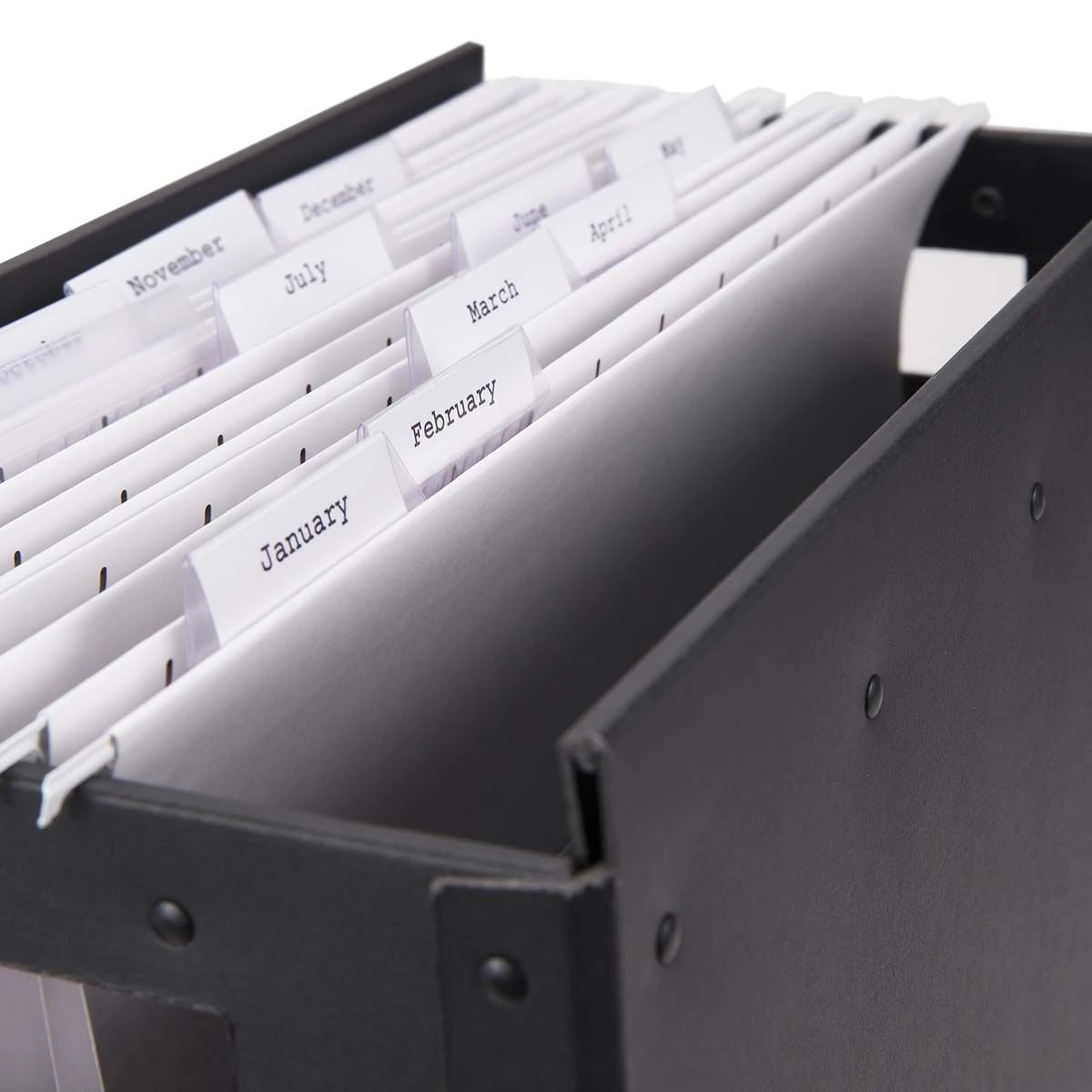 Cette boîte noire à dossiers suspendus permet de classer ses dossiers de bureau et de les avoir facilement à portée de main. Avec ses rivets et sa couleur noire, elle a un petit look industriel qui conviendra à beaucoup de bureaux. Cette boîte de classement est livrée avec 8 dossiers suspendus blancs et leurs étiquettes.