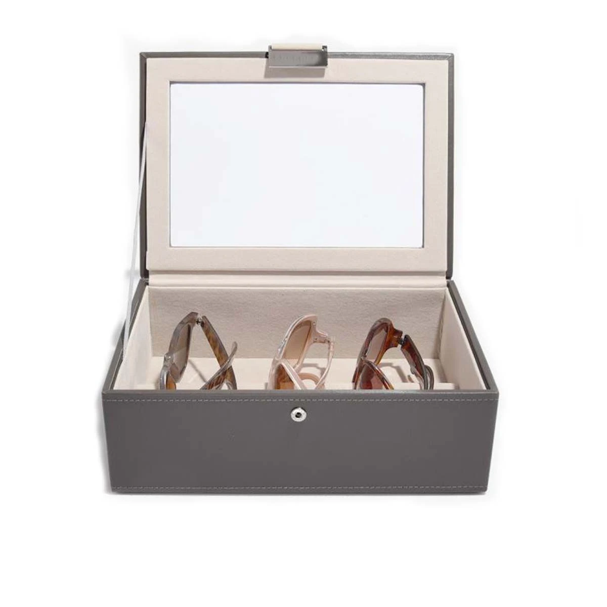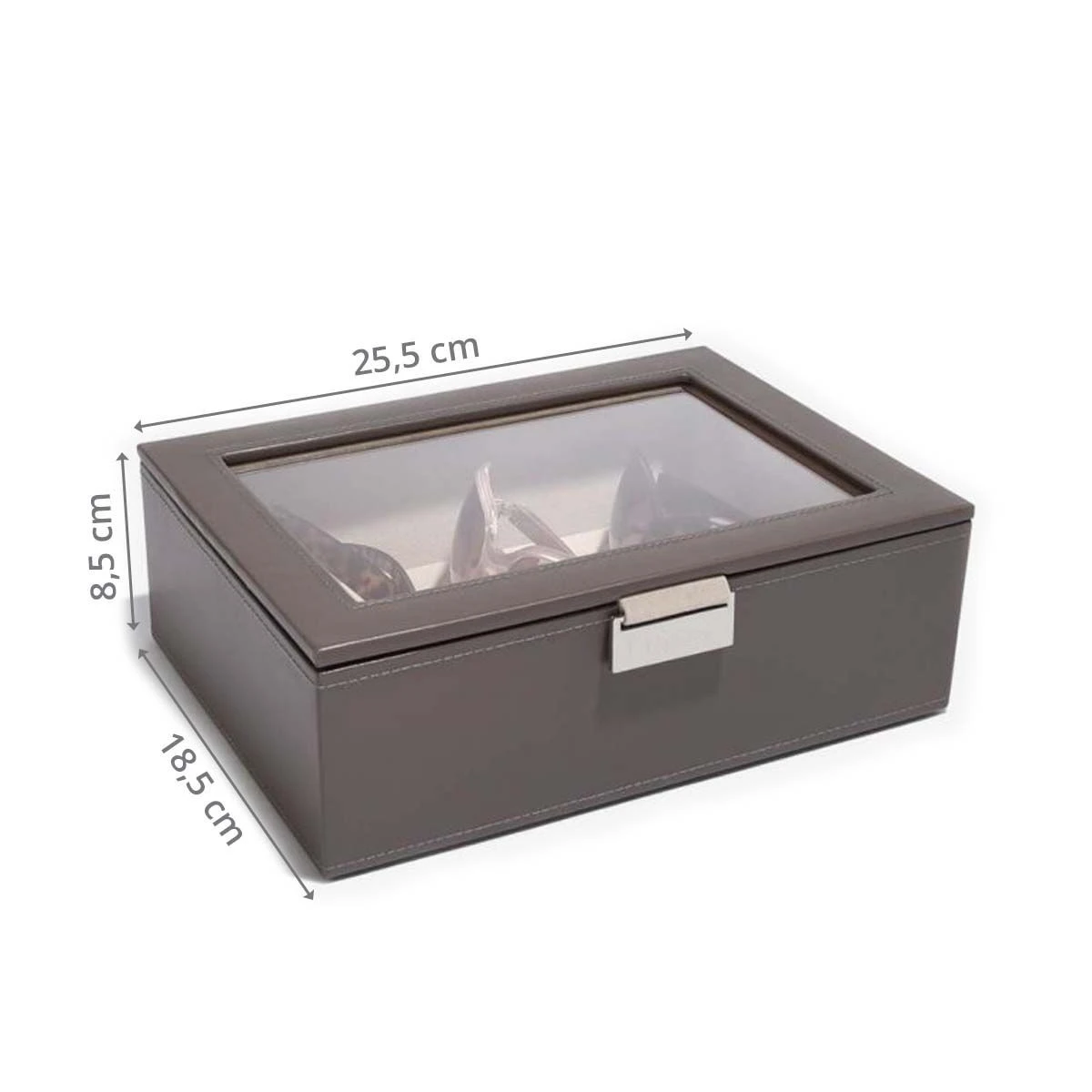 Ce coffret Ă lunettes permet de ranger de 4 Ă 7 paires de lunettes de vue ou de soleil. Cette boĂ®te est très utile pour retrouver facilement ses lunettes et pour les ranger dans un endroit protĂ©gĂ©. De belle qualitĂ©, cette boĂ®te de rangement en similicuir taupe a un couvercle transparent pour voir d’un seul regard toute la collection de lunettes. Son intĂ©rieur en velours empĂŞche les lunettes de se rayer.