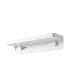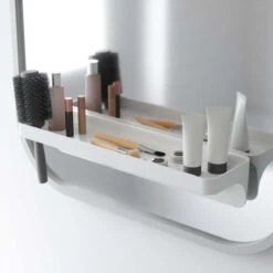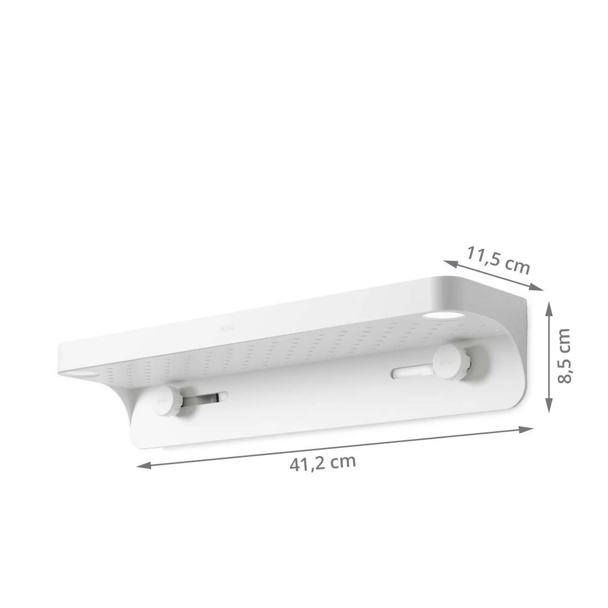 A l’aide de ses ventouses, cette étagère de salle de bain se fixe facilement sur une surface non poreuse (miroir, carrelage….) pour créer une nouvelle surface de rangement. Sobre et design, elle est en plastique blanc perforé pour que l’eau ne stagne pas. Vous pourrez donc même la fixer dans une douche sans craindre qu’elle ne se transforme en bassine. Elle sert à poser shampoing, savons, flacons de parfum, tubes de crème, verre à dents…. Cette tablette possède à chaque extrémité 2 trous d’environ 3 cm de diamètre dans lesquels vous pourrez suspendre rasoir ou brosse à cheveux.