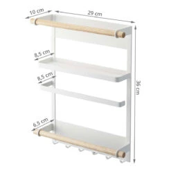 Idéale pour les petits espaces, cette étagère magnétique vous fera gagner de la place dans une cuisine. Elle vous permettra de transformer la porte d’un réfrigérateur, ou toute surface métallique, en espace de rangement. Cette étagère compacte et complète comprend un étage pour les bocaux et petites bouteilles, un axe pour le rouleau essuie-tout, une tringle en bois pour un torchon et 6 crochets pour y suspendre ciseaux, cuillères en bois, manique…
