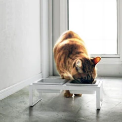 Dans cette double gamelle, vous pourrez laisser à la disposition de votre chat croquettes et eau. En céramique et métal blanc, elle est élégante avec ses lignes épurées. Cette gamelle ne dénaturera pas une cuisine, une entrée, un salon ou tout autre pièce de la maison. Les écuelles carrées sont amovibles et passent au lave vaisselle.