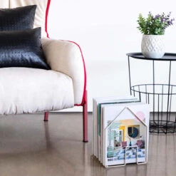Ce porte-revues blanc est pratique et dĂ©coratif avec sa forme de maison. Il ira très bien dans un salon, une salle d’attente ou mĂŞme des WC pour y entreposer des revues. Au moins 6 magazines peuvent y ĂŞtre entreposĂ©s : 1 par compartiment. Design et discret, ce porte-revues en mĂ©tal vous Ă©vitera d’ĂŞtre envahi par les journaux et vous forcera Ă les trier rĂ©gulièrement.
