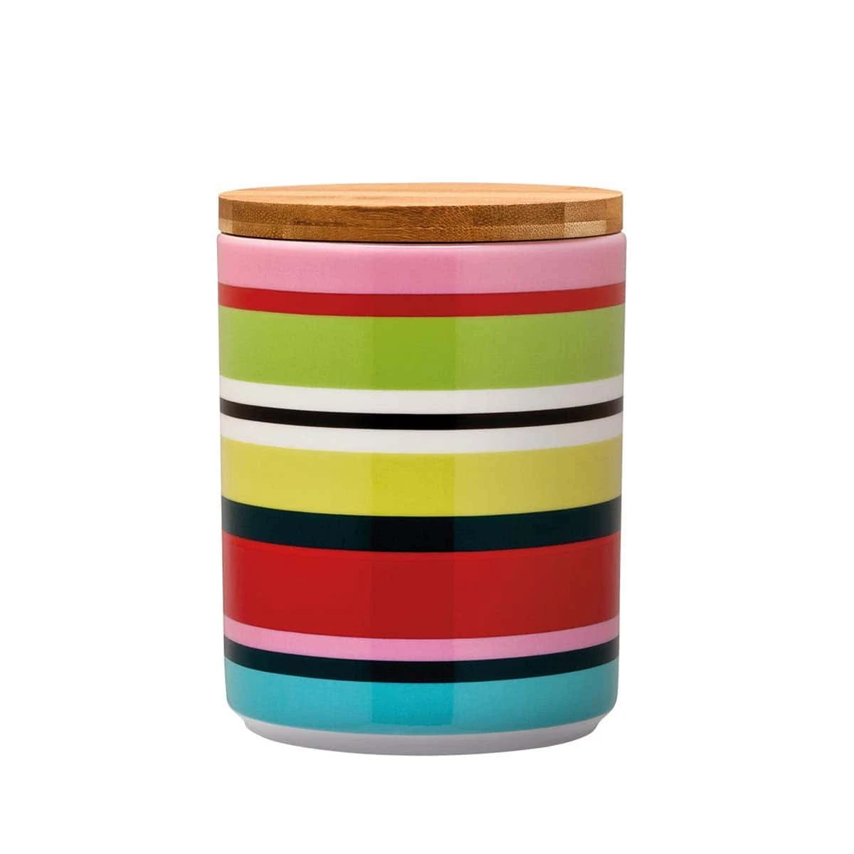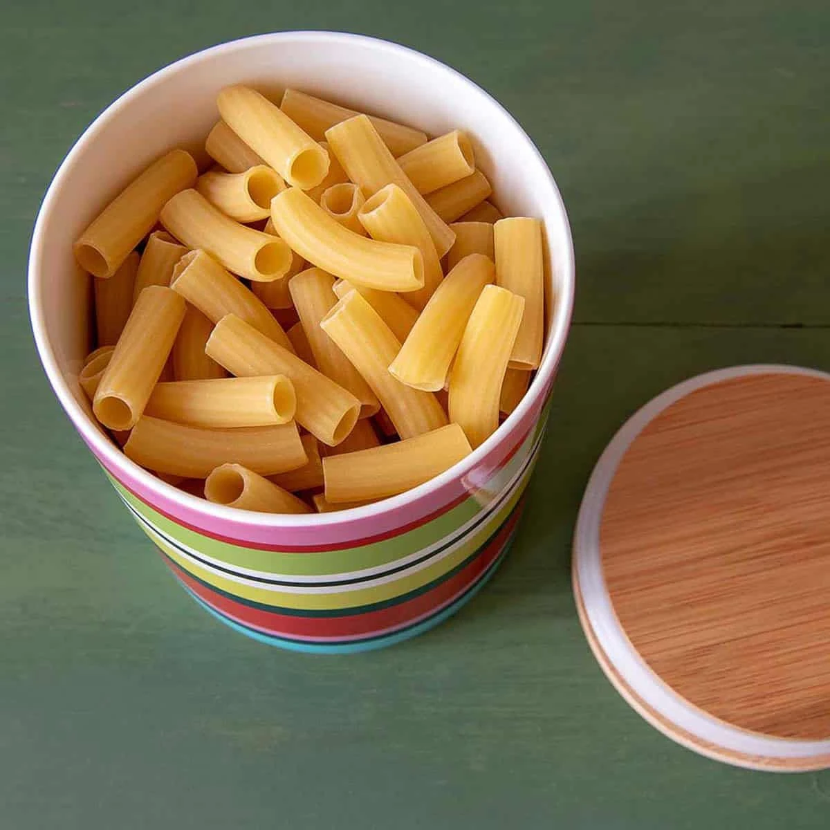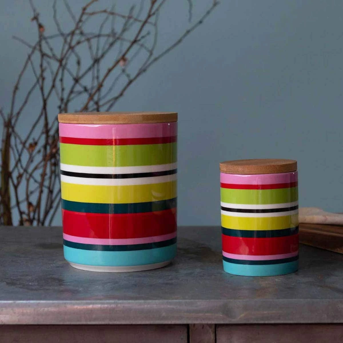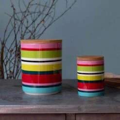 Ce pot en céramique ajoutera de la couleur à votre cuisine. Il est décoratif et original avec ses rayures colorées. Il ira très bien sur le plan de travail ou sur une étagère ouverte.
