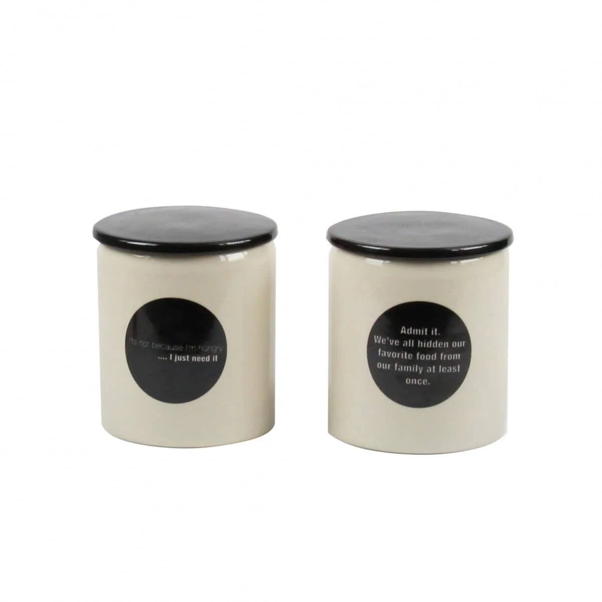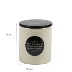 Dans ce pot en céramique vous pourrez stocker vos meilleurs produits à l’abri de la lumière grâce à son couvercle noir. Original avec sa pastille noire, il donnera un côté design à votre cuisine. Plein d’humour, il nous fait avouer que parfois on garde égoïstement pour nous tout seul nos meilleurs produits. Qui n’a pas caché ses bons chocolats pour ne laisser que les plaquettes industrielles aux enfants et peut-être à son conjoint ?