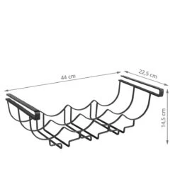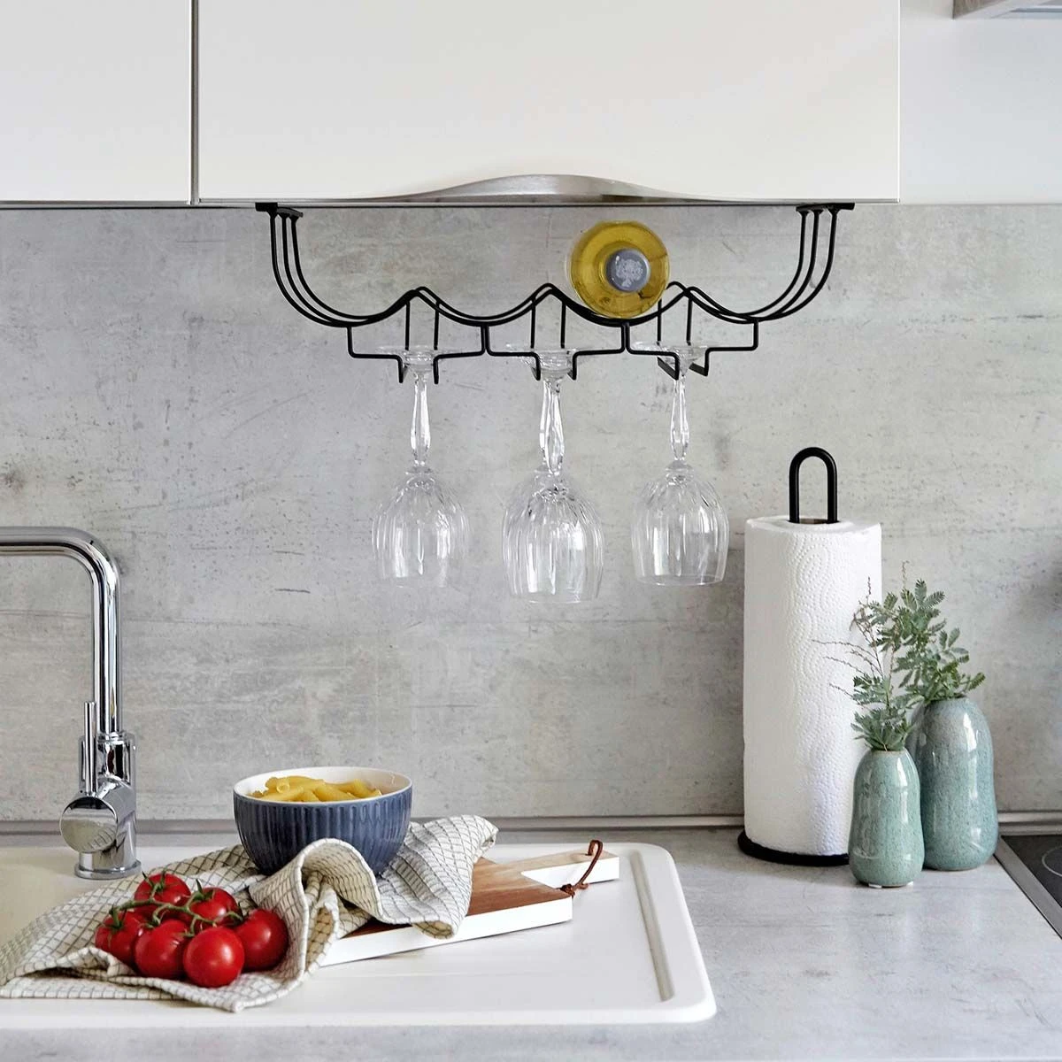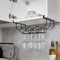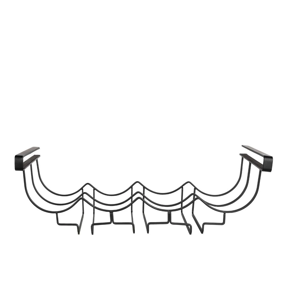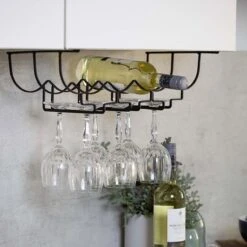 Ce rack à verres noir est polyvalent. Il permet de ranger 4 bouteilles et d’y suspendre des verres à pied. Il se glisse très facilement sur une étagère de moins de 2 cm d’épaisseur. Ce porte-bouteilles ira aussi bien dans une cuisine que dans le coin bar d’un salon. En métal noir, il est élégant et n’a pas besoin d’être caché dans un meuble.
