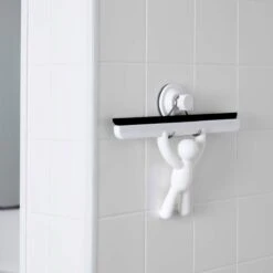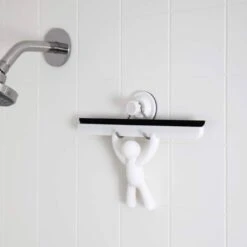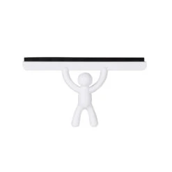Cette raclette de douche est amusante avec son bonhomme blanc. Ludique, elle est également très pratique. Sa ventouse se fixe fermement à une paroi de douche ou à un mur de salle de bain, sur une surface lisse. Le manche en forme de bonhomme se prend aisément dans la main.