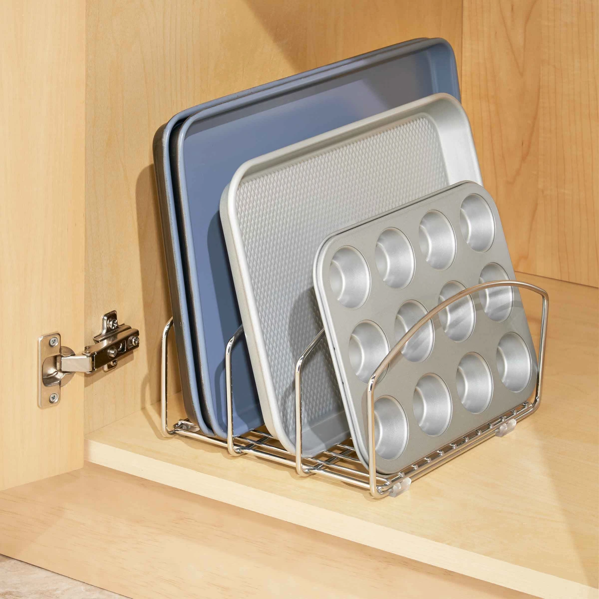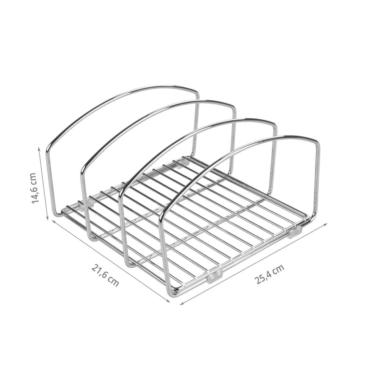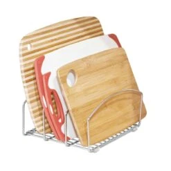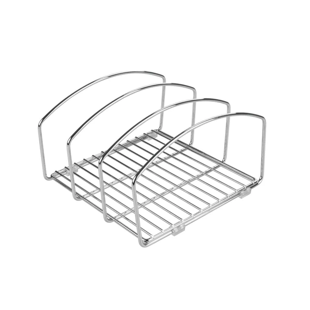 Ce rangement en métal chromé permet de ranger planches à découper et plateaux dans une cuisine. Que ce soit dans un placard ou sur un plan de travail, il permet d’organiser à la verticale les accessoires de cuisine longs et plats en les rendant plus facilement accessibles. Ce séparateur possède 3 compartiments pour une organisation par catégorie : les planches d’un côté, les moules à tartes de l’autre, les plateaux au milieu… Il peut aussi servir dans un haut tiroir pour organiser les couvercles de boîtes alimentaires qui sont souvent difficiles à ranger.