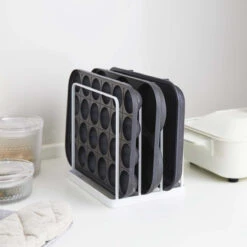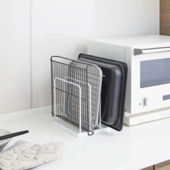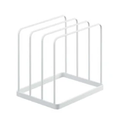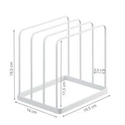 Ce rangement à 3 compartiments est très pratique pour maintenir à la verticale plateaux de cuisine et planches à découper. Il se pose sur le plan de travail ou dans un placard suffisamment haut. Ce rangement rend les accessoires de cuisine plats beaucoup plus accessibles. Avec cette couleur blanche et sa matière en métal, il est sobre et peut très bien être mis en évidence sur une étagère sans dénaturer la cuisine. Ses 4 pieds antidérapants lui assurent une bonne stabilité.