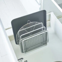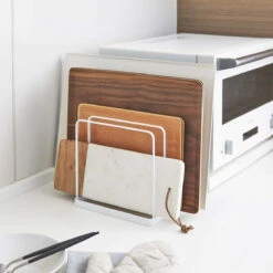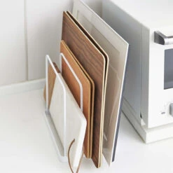 Rangement pour plateaux et planches de cuisine en mĂ©tal peint en blanc.Â
