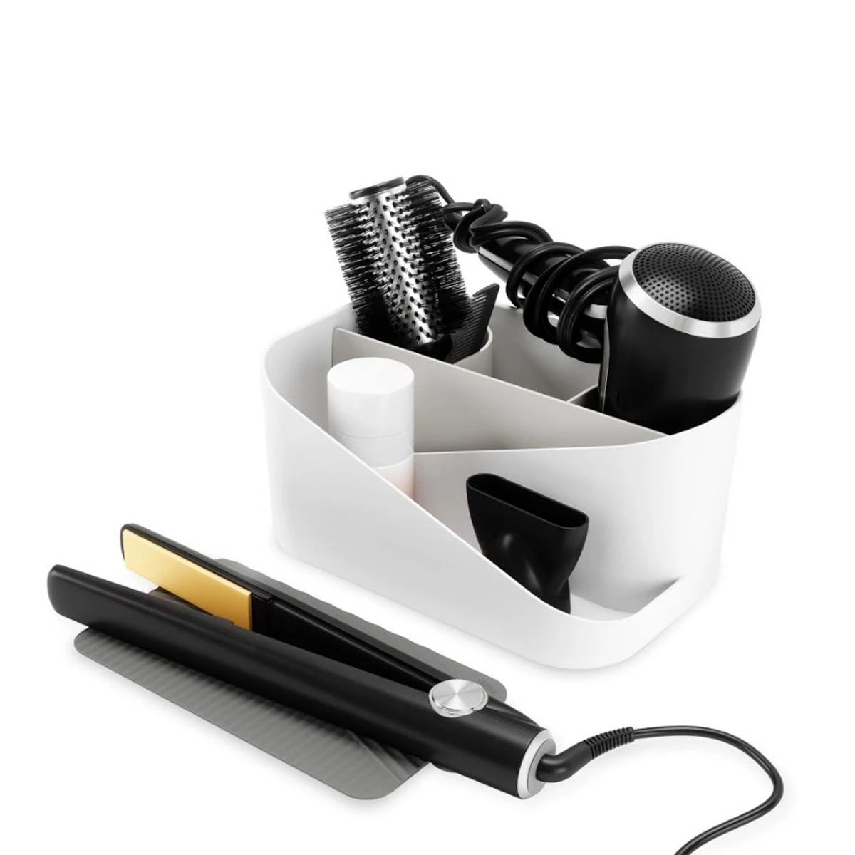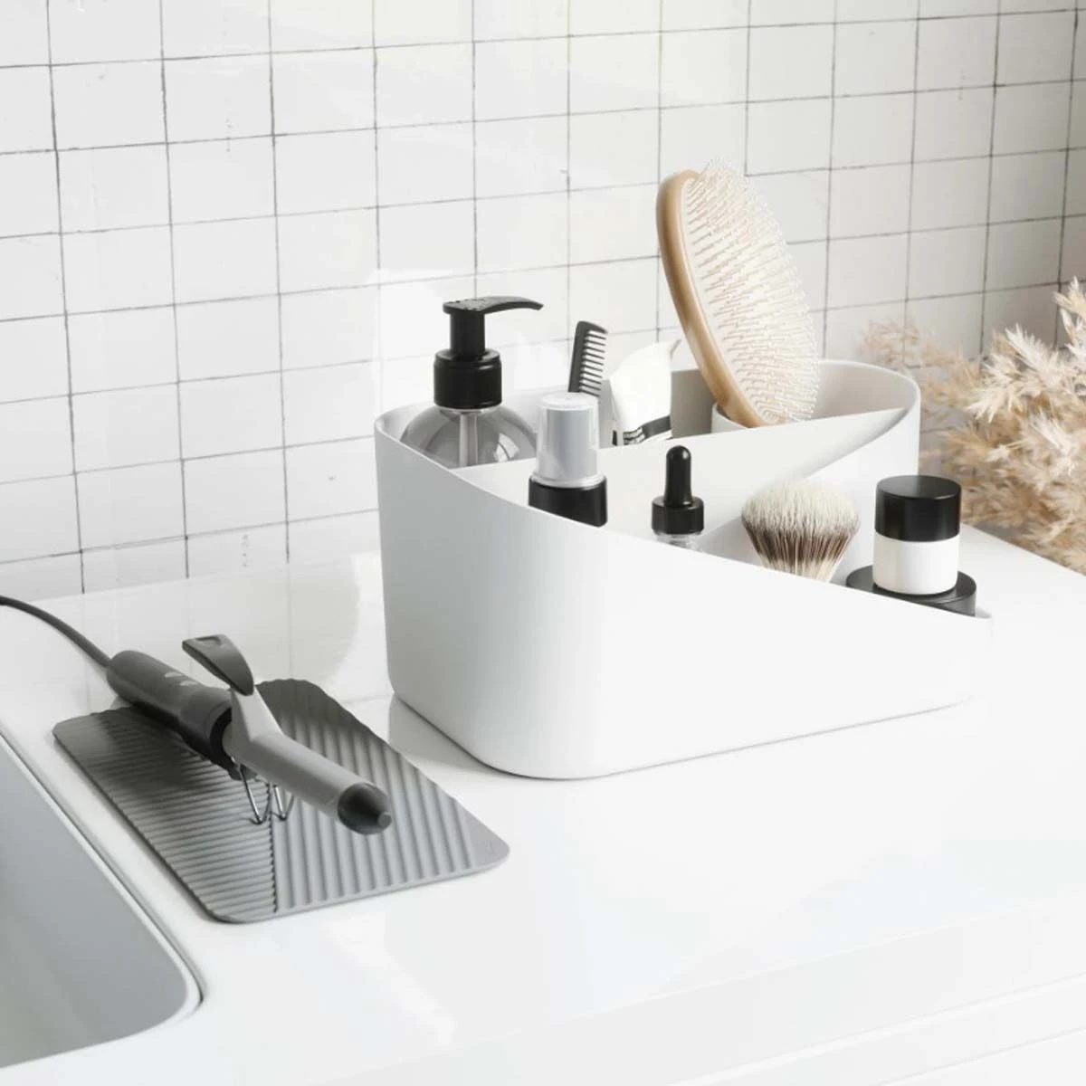 Ce rangement Ă compartiments est idĂ©al pour un sèche-cheveux et un lisseur. Il permet de les avoir Ă portĂ©e de main sans qu’ils encombrent la salle de bain. Ce rangement est Ă©quipĂ© d’un tapis silicone sur lequel poser le lisseur encore chaud ou tout autre appareil de coiffure. Cela Ă©vitera d’abĂ®mer le plan de la salle de bain ou la table près de votre miroir.