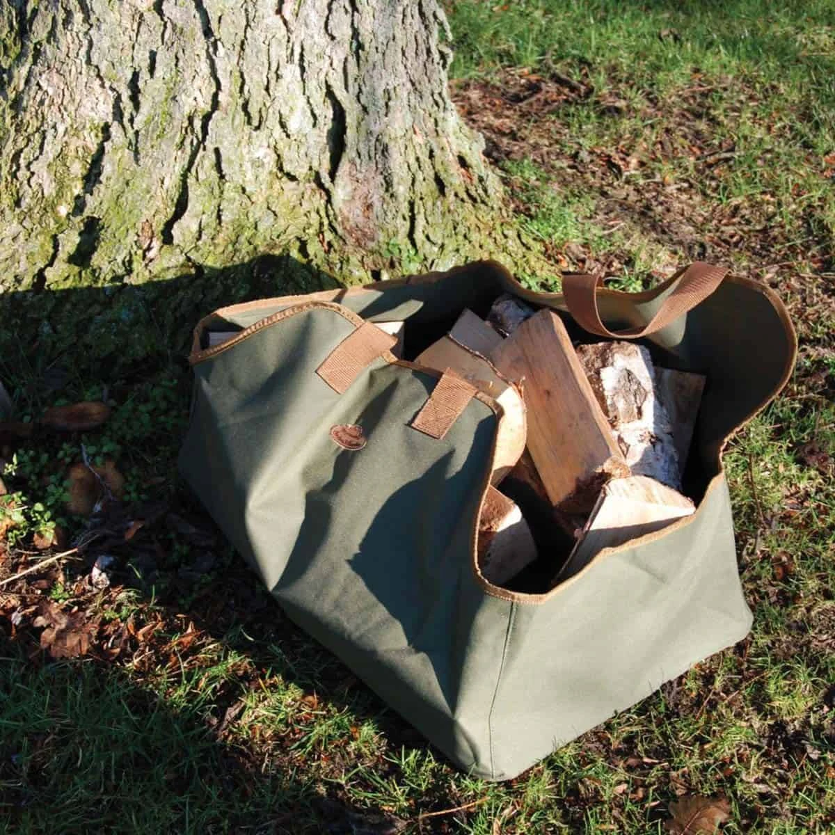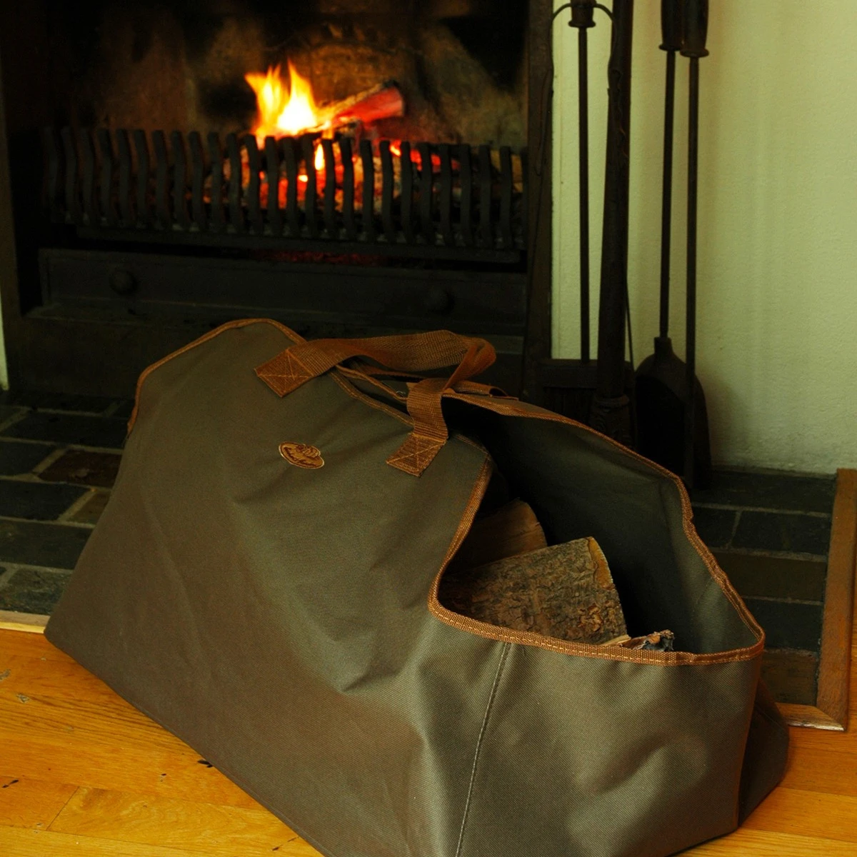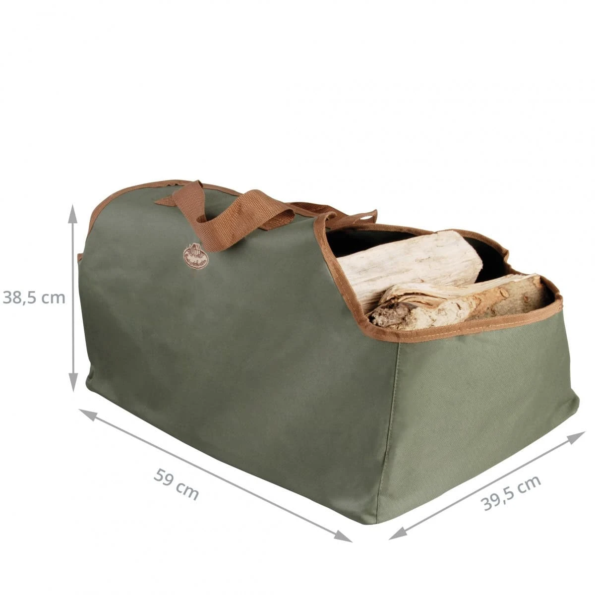Sac à bûches en tissu épais Kaki avec une bordure marron.