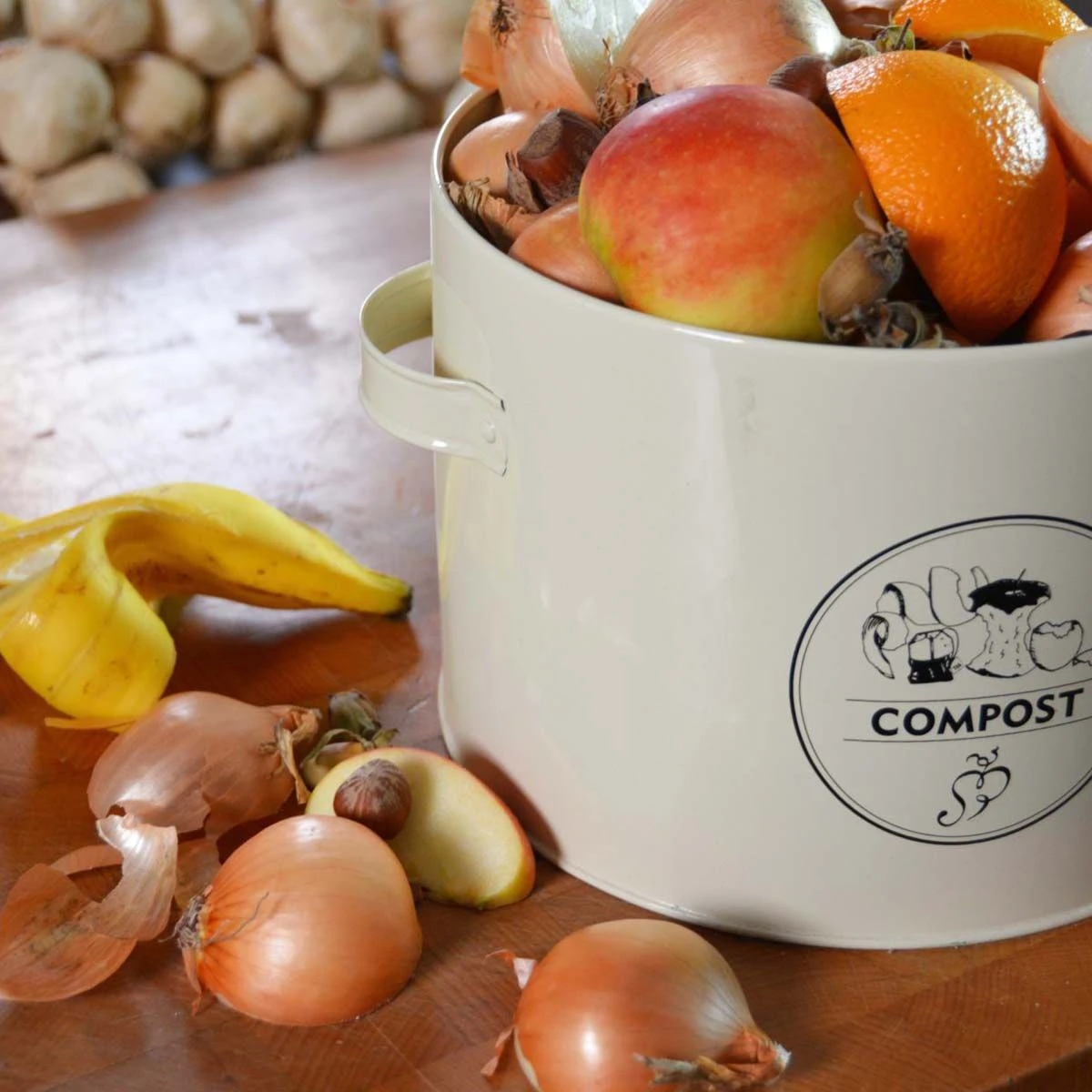 Poubelle à compost en métal crème.
