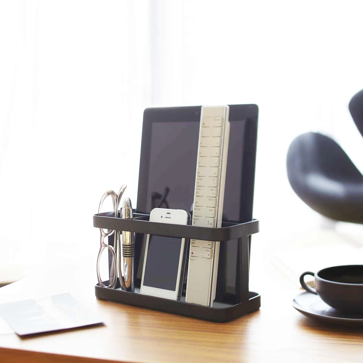 En acier noir, ce vide poche trouvera sa place dans une entrée, un bureau ou un salon. Idéal pour y ranger portables, tablette, lunettes ou clés, il vous rendra bien des services. Avec ses 3 compartiments chaque objet a sa place. Design et discret, il fera aussi un joli cadeau utile et esthétique. Il peut même être utilisé près de la télévision comme porte télécommandes.